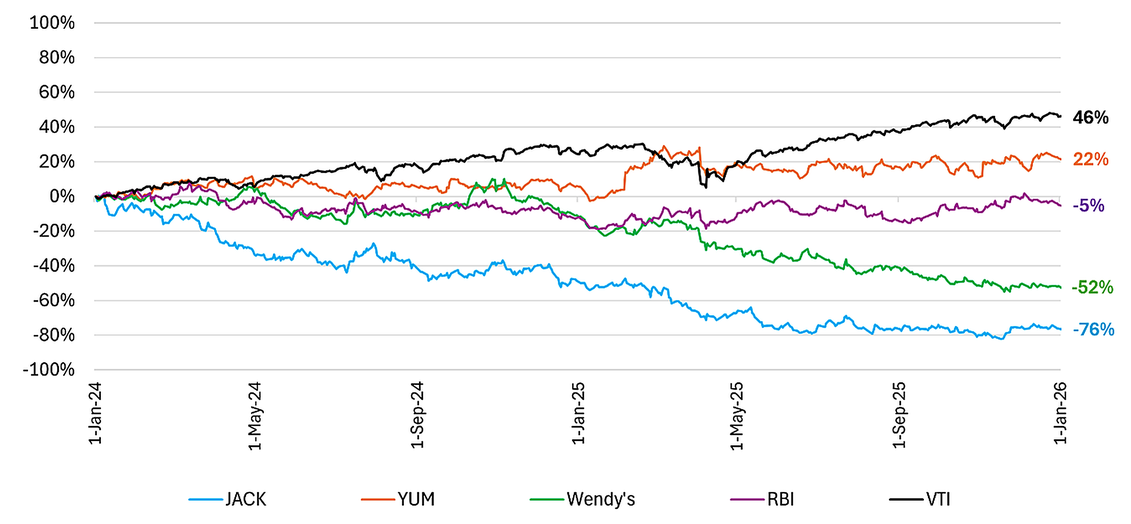 Over just the past two years, Jack in the Box (NASDAQ: JACK) has yielded a -76% return for investors, significantly under performing peers and the total market (see Figure I).