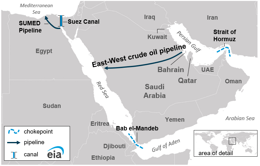A possible mitigant is the transfer of oil to the Red Sea (and Suez Canal) via the East–West Crude Oil Pipeline. This will help, but only at the margin as the pipeline can only carry 5M barrels of crude per day compared to normal shipments through the Strait of Hormuz of 20M barrels per day.