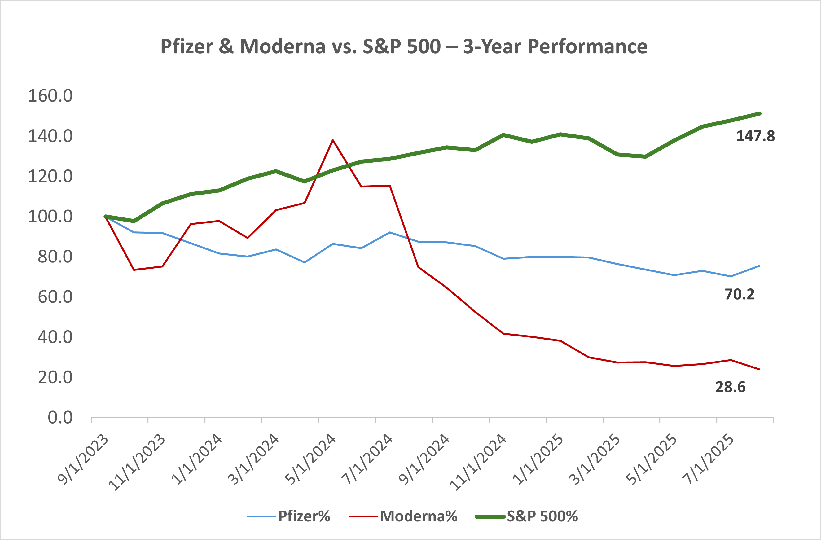 Both Pfizer’s and Moderna’s shares collapsed over the past three years, as shown below: